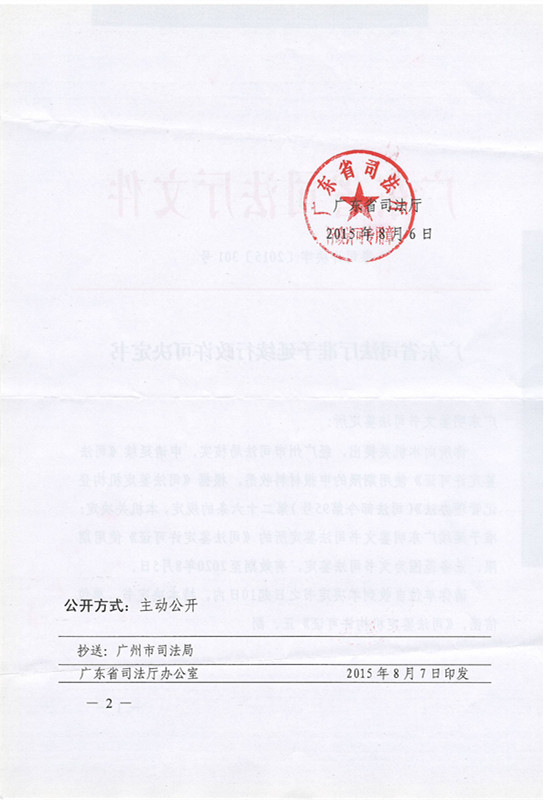 2015年8月6日,广东省司法厅文件 粤司许决字【2015】301号 《广东省司法厅准予延续行政许可决定书》:“广东明鉴文书司法鉴定所:你向本机关提出,经广州市司法局核实,申请延续《司法鉴定许可证》使用期限的申报材料收悉。